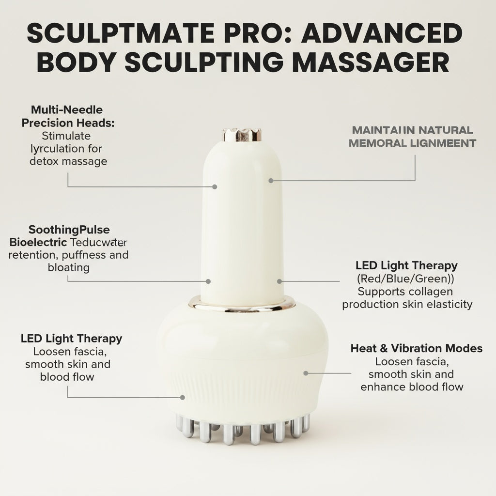 SculptMate Pro is a cordless, USB-C rechargeable massage and light therapy device designed for full-body contouring, lymphatic stimulation, and skin toning.