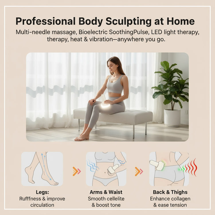 Experience multi-needle massage, Bioelectric SoothingPulse, LED light therapy, soothing heat, and adjustable vibrations across legs, arms, waist, back, and thighs. Portable USB-C rechargeable design works seamlessly with lotions, oils, or conductive gels for spa-quality results at home.